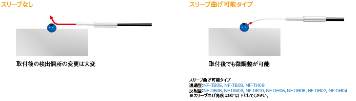 スリーブの長いタイプは、スリーブに曲げを加えることが可能(R10mmまで)。取付個所を決めたあとでも、検出個所の微妙な調整が可能です。