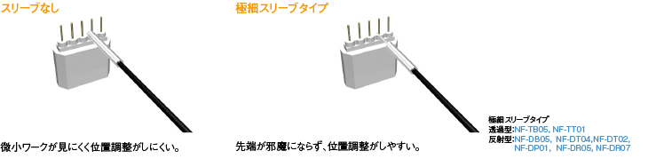 スリーブタイプは先端が細く、ワークに近付けて検出する場合でも先端にワークが隠れてしまうことがないので、取付時の検出個所の位置合わせが簡単に行えます。