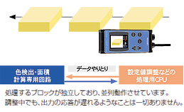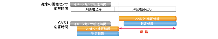 通常は、イメージセンサからの信号をいったんメモリに書き込み、そのデータを再度読み出して処理します。CVS1は、このメモリを排除し、イメージセンサからの転送と並列して全ての処理を行います。そのため、イメージセンサからの転送が完了した直後に判定結果を出力することができます。
