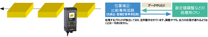 設定項目「CVS1」の切換により、方向や形状を判別するパターンマッチングセンサとしても、色をその面積で判別する色