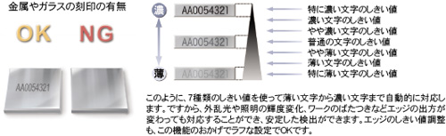 微分画像を1つのしきい値で二値化するのではなく、設定値から24小さい値まで7段階でエッジを生成します。登録画面と比較する際に、7段階のエッジを比較して最も適した値を採用します。外乱光、ワークのばたつき、照明の輝度低下、ワークの速度変化などに強い、安定