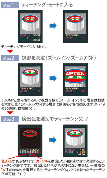 ティーチングは、わずか3段階で完了。カラーセンサ並みの 簡単さで30秒もあればティーチング終了です。