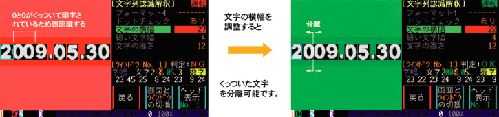 文字の間隔が狭く、くっついて撮影されても設定値“文字の横幅”で一文字ずつ分離して認識することが可能です。