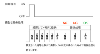 1回の撮影で最大6回連続で撮影し、順番に画像処理する機能です。同期入力が安定しない場合や、ワークの位置ズレが大きい場合などに有効です。また、シャッター時間可変連写機能も装備。連写時にシャッター時間を最大+36/-24%まで変化させて撮影するので、外乱光などでワークの明るさが変動する場合に威力を発揮します。