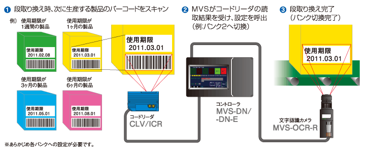 コードリーダCLV/ICRシリーズをコントローラMVS-DNに接続すれば、製品に印刷されているコードを読み取ることでバンク切換が可能。段取り換え時のヒューマンエラーを防止するとともに、時間のムダを省きます。