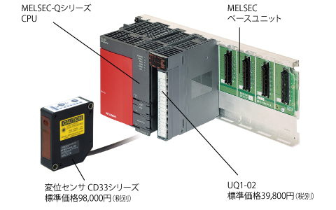 さらに関連製品として、CD33シリーズと三菱電機PLCシーケンサMELSEC-Qシリーズを簡単接続できる変位センサコントロールユニットUQ1-02を発売します。これにより、MELSEC-Qシリーズのベースユニットに直接取り付けるだけで、CD33シリーズの測定値取得・演算・判定が最速500μs(0.1ms)周期で行えます。接続はユニットを差し込むだけで、ユニットや変位センサの通信設定は不要。各種設定は専用の無償ソフトウェアで簡単に行えます。MELSEC-Qシリーズとの接続ユニットは、変位センサCD5シリーズ用のUQ1-01に続き、当機で第二弾となります。