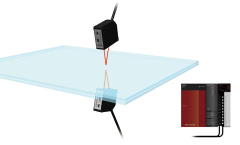 レーザ変位センサCD33-L30N□でガラス基板投入時の1枚/2枚を判別し、2枚送り時に基板が割れてしまうのを防止します。