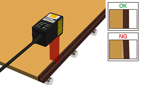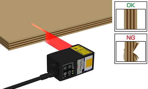 合板を切断する際にできる割れ・欠けおよびバリの有無を形状計測センサLSシリーズで検査します。