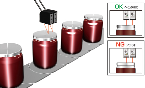 しっかり密閉されているとフタがへこんだ状態になりますが、密閉されていないとフタがフラットな状態になるので、その差を検出します。搬送ラインのバタツキを考慮し、フタの中心と外側を測定してその差が規定値以上あればOK、なければNGとして検出します。