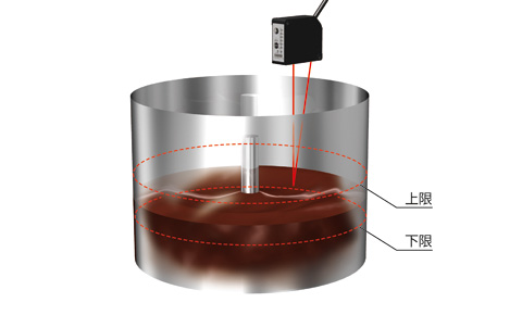 レーザ変位センサCD33-250N□で、ホッパー内のチョコレートペーストの上限と下限レベルを検出します。