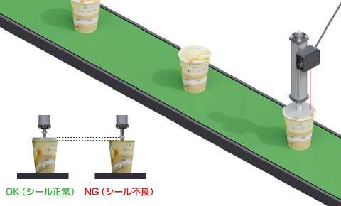 カップのふたをシリンダで一定の圧力で押してその高さを測定し、シール不良があれば空気が漏れてシリンダーが良品時より沈むことで判別が可能。内蔵のコンパレータ出力により、センサ内でしきい値を設定し判別させることができます。