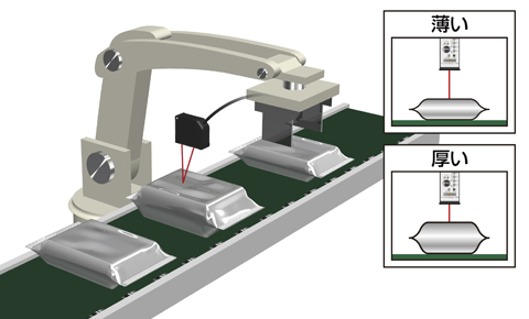 厚みを安定して測定できるので、ワークを掴みに行く際のロボットアームの高さを正確に制御することが可能です。