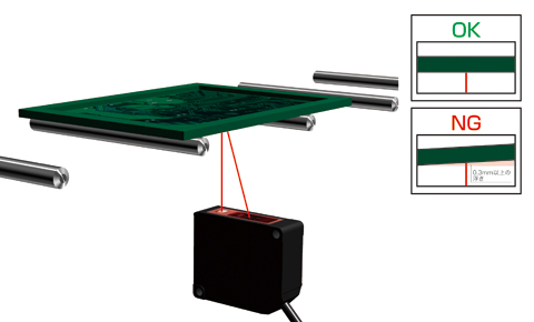 SICK社のエッジ測定センサAS30シリーズで、プリント基板のエッジを測定し、X・Y方向の位置ズレを検出します。