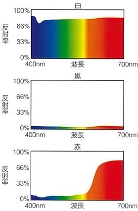 ここで人間の目やカメラが色の違いをどのように認識しているかを考えてみる。一般的に物体には色があると考えるのが普通であるが、実際は物体に色はない。照射する光の波長を変えると、今までの物体の色は全く別の色になってしまうのである。物体に色があるのではなく、光を反射する性質に波長毎の違いがあり、その結果反射される光に変化を及ぼし、その光の明暗を色として認識しているに過ぎない。