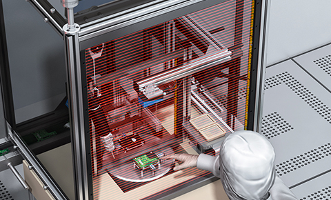 ロータリーテーブルの半自動組立ステーションの安全用に、セーフティライトカーテンmac4を使用します。