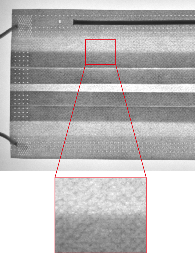 拡散タイプのバックライト照明では、マスクを透過する際に光が散乱し、折り目部分がぼやけて映ってしまいます。これに対して狭指向角タイプは、指向性の高い照射により、折り目部分は透過せず黒くくっきりと撮像できます。周辺部とのコントラスト差を出せるため、高精度な検査が可能です。