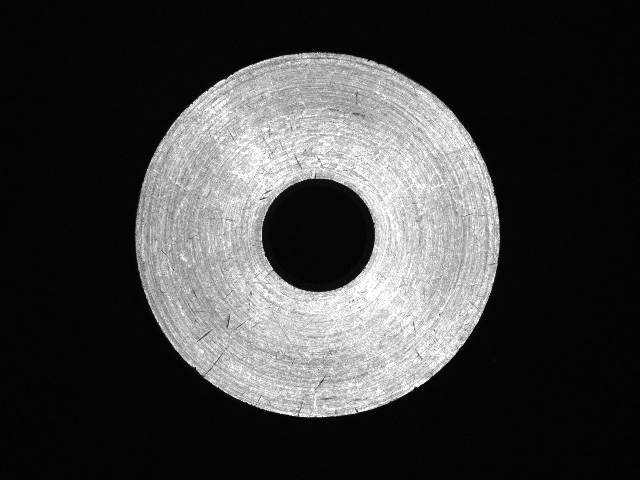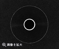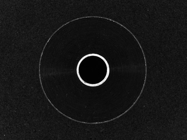 同軸照明を使用すると金属部品表面は鮮明に撮像できますが、角度が付いたテーパー部は光が返ってこないため暗く映ってしまい、測定が不可能です。ワークに対して近距離から浅い角度で照射するローアングル照明を使用すれば、斜め方向から照射された光が光沢のあるテーパー部で反射します。さらに拡散板により照明の発光部を均一にすることでテーパー部だけを白く撮像でき、高精度な測定が可能になります。
