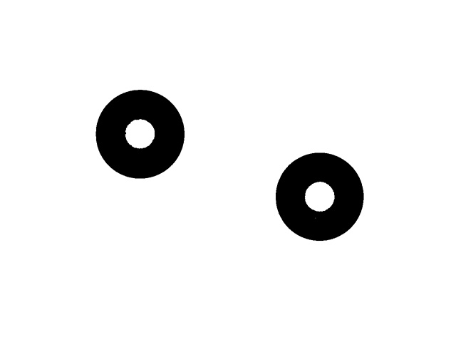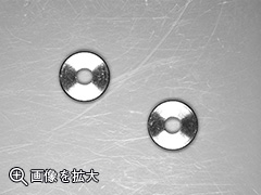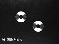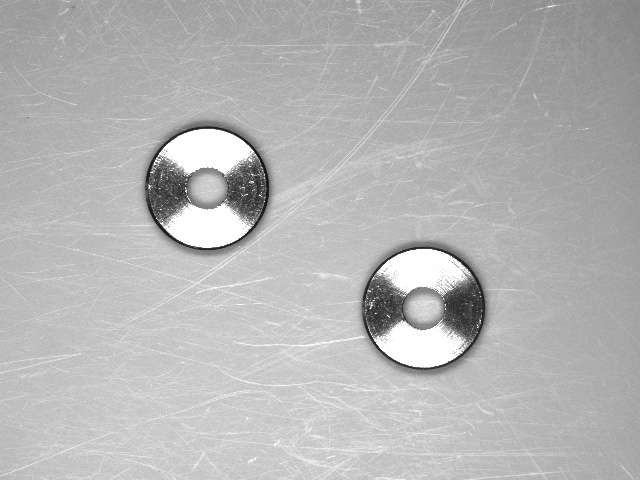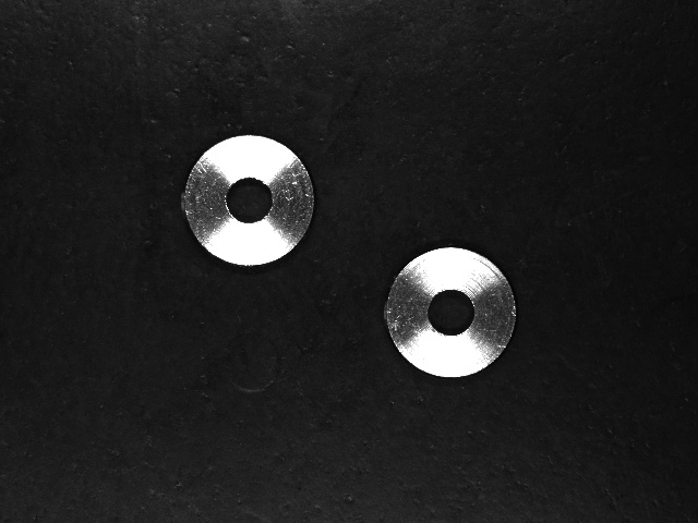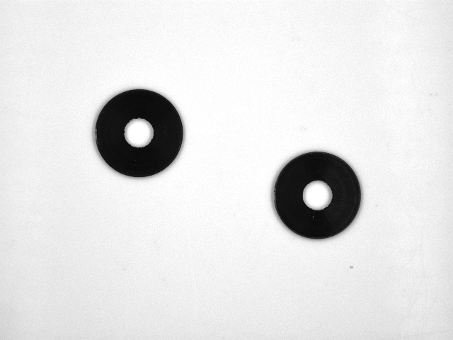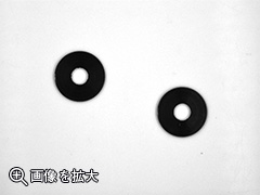このような場合、偏光フィルタが有効です。照明とカメラに偏光フィルタを付けることで、ぎらついていた金属部品を黒く、白背景は白いままで撮像可能です。