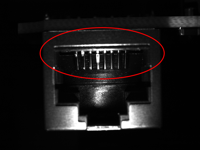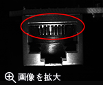 LANジャック内のコネクタにフラックスが飛散して付着しているかどうかの確認をモノクロカメラで行います。