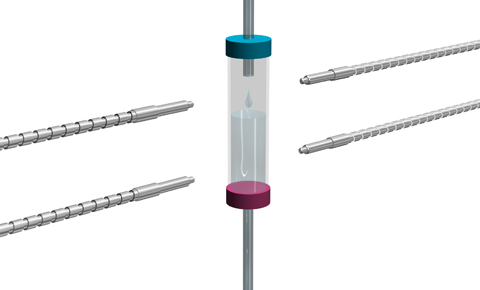 ファイバユニットNF-TW01と水検出用ファイバアンプD3IF-TNで、スポイトに注入された薬液の有無を検出します。