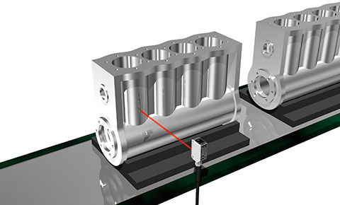 外形の異なる金属の継手を30mm幅のレーザで判別します。DSTA-200は平行投光を実現しているので、距離が一定でなくても安定した判別が可能です。