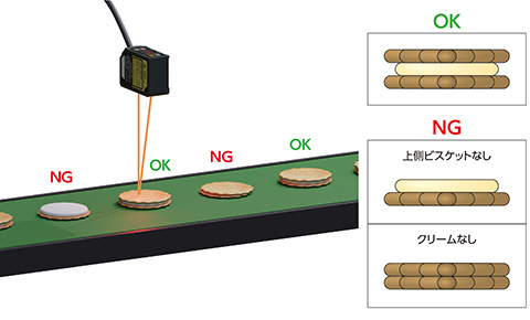制御出力を2系統装備しているBGS-HDLなら、ビスケットの有無を出力1で、高さの違いによる良/不良判別を出力2で検出することが可能。通常なら2台のセンサで検出するアプリケーションですがBGS-HDLなら1台で実現可能です。