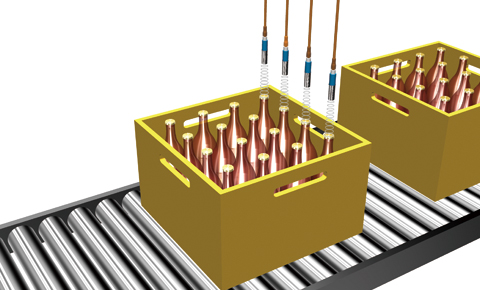 超音波センサは光電センサに比べて検出領域が広いので、ケース内でビンががたついても安定して検出することが可能です。
