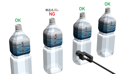 PETボトルのシュリンクラベルのズレをカラーパターンマッチング画像センサMVS-PMで検査します。ラベルの端や特徴的な部分を登録して検査するので、正常であればOK、ズレがあればNGと判定することが可能です。