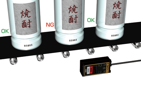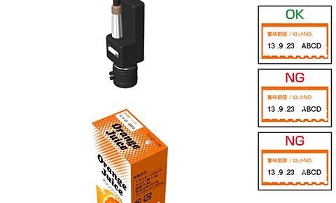 文字認識画像センサMVS-OCR-Rで、日付部分は正しい印字かどうかの認識検査、ロット番号部分は文字として読めればOKだが欠けやにじみはNGとする検査を行います。