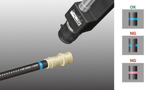 自動車用ホースにマーキングされたマークをカラーパターンマッチング画像センサMVS-PM-Rで検査します。