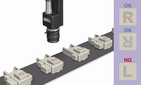 回転サーチ機能で正しい文字であれば上下が反転していてもOKと判定することが可能。形状の異なるLの文字のブロックだけを確実に仕分け/排出することが可能です。