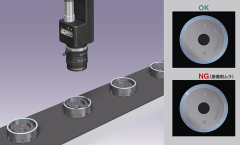 金属部品の接着剤塗布ムラを、画像センサMVS-PM-Rで判定します。