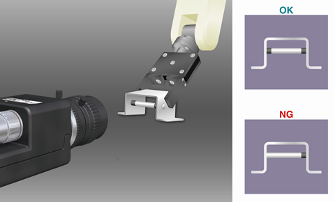 部品に正しくヒンジが組み付けられているかどうかを、画像センサMVS-PM-Rで検査します。