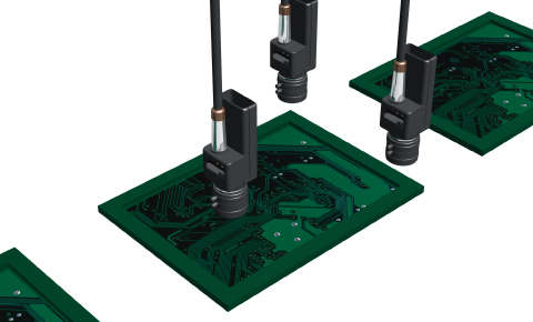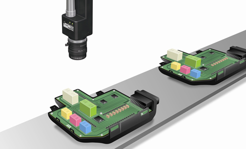 パターンマッチングカメラMVS-PMで赤と青のマークを検出し目視検査が完了しているかどうかを検出し、2次元コードリーダLECTOR620で基板の異品種混入を検査します。