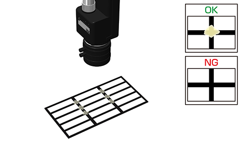 接着剤の形は一定していないので、接着剤がない状態でティーチングし、出力を反転すれば接着剤なしでNGと判定することが可能です。接着剤が透明の場合は、バックライト照明を選定すればその陰影により、安定してその有無を検査することができます。