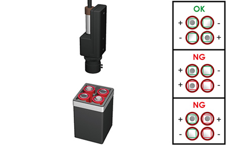 カラーパターンマッチング画像センサMVS-PM-Rの汚れ面積モードで電池の挿入方向の検査を行います。