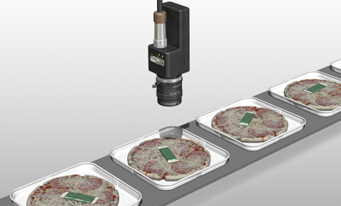 冷蔵ピザ上に載ったソース袋有無を、カラーパターンマッチング画像センサMVS-PM-Rの色面積モードを使って検査します。