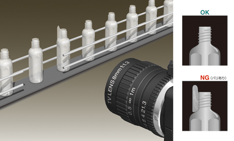 弁当や惣菜に使用するプラスチックの醤油ミニボトル製造工程において、ボトルのバリをカラーパターンマッチング画像センサMVS-PMで検出します。