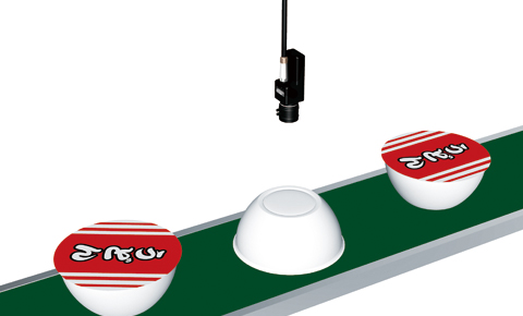 パターンマッチングカメラMVS-PM-Rで、カップ麺が正しい向きで搬送されているかどうかを検査します。