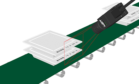 通過位置にバラツキのあるラインで、個装箱に印字された賞味期限の日付を検査します。