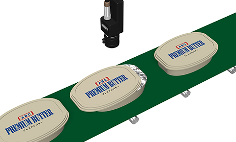 カラーパターンマッチングカメラのMVS-PM-Rで、バターの容器のフタの位置ずれを検査します。