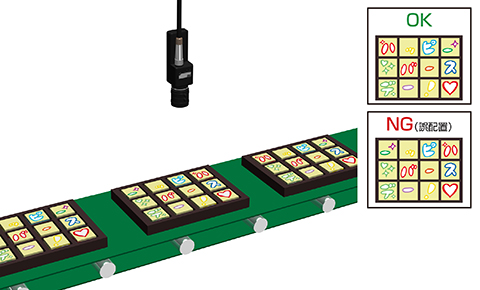 パターンマッチング画像センサMVS-PM-Rでチョコレートが正しい並びで配置されているかどうかを検査します。