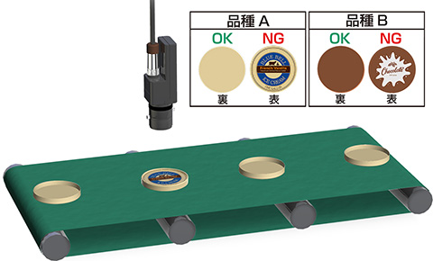 裏向きがOK、表向きがNGとなりますが、MVS-PM-Rであれば、表面のパッケージイラストの面積を検出し、正確なNG判別が可能です。さらに汚れ面積モードであれば、色の違いではなく模様の有無を確認するので、品種Aから品種Bへの段取り替えがあってもカメラの設定を変えることなく検査が可能です。