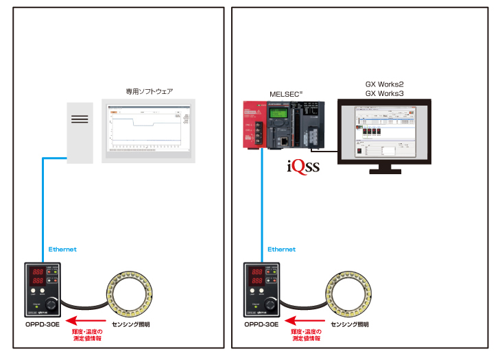 イーサネット対応LED照明コントローラ「OPPD-30E」との接続により、輝度・温度の 測定値をモニタリングでき、モニタ値に対して調光値フィードバック制御を行うことで 明るさを一定に保つことができます。
