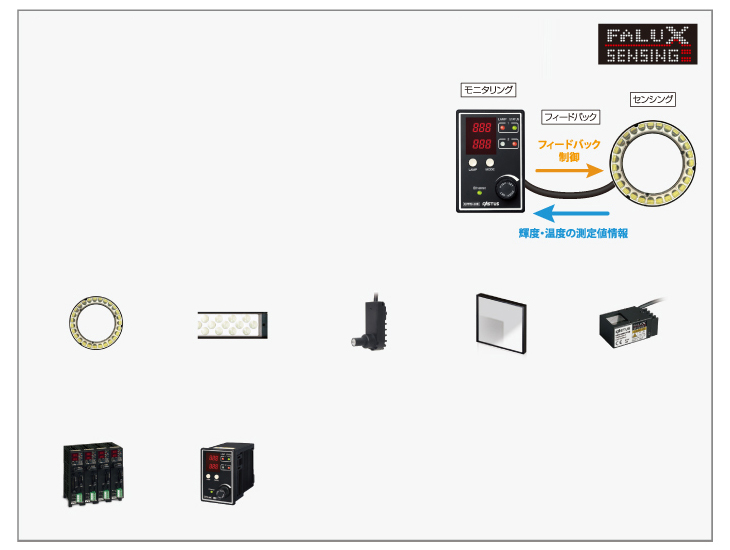 オプテックス・エフエーのセンシング照明は、独自機能「FALUX sensing」に対応し、 照明に内蔵したフォトダイオードでLEDの輝度を測定します。