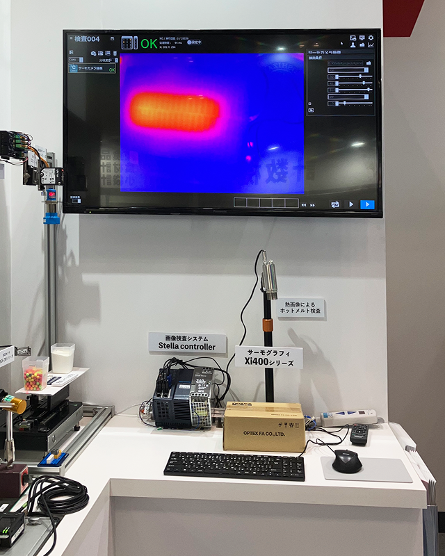 段ボールのホットメルト接着確認を想定し、段ボールの中に設置した熱源をサーモグラフィと画像処理システムで検査している様子を展示しました。フラップ越しに温度を可視化する様子に驚かれるお客様が多くいらっしゃいました。