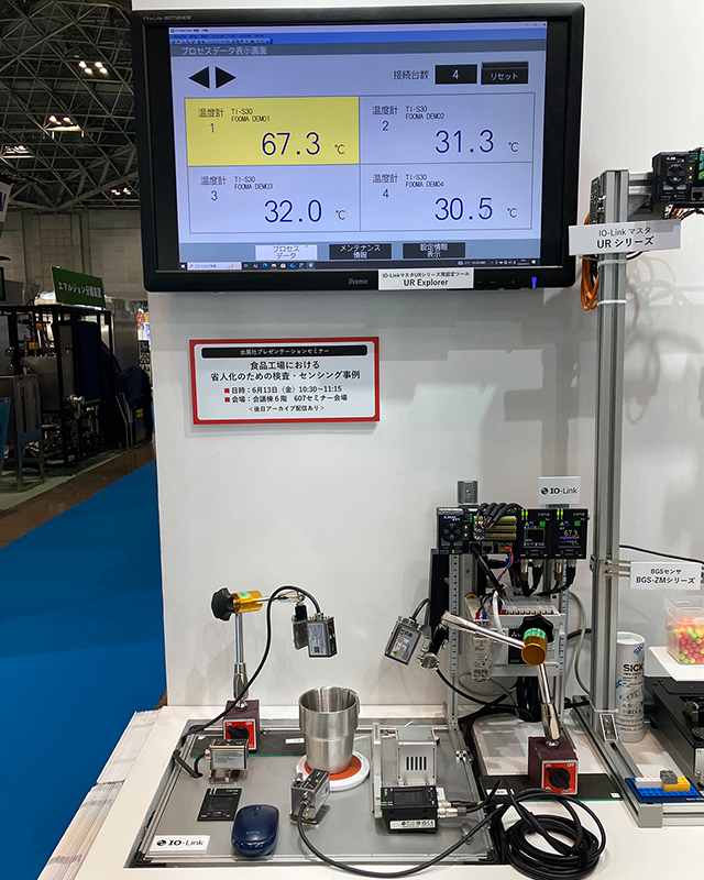温めた容器を非接触温度計TI-Sで測定し、IO-Linkマスタを介してモニタにデータ表示するデモンストレーションを行いました。