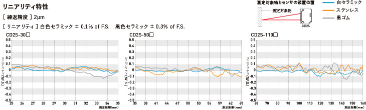 CD2Sシリーズは、白セラミック、ステンレス、黒ゴムと、測定対象物の材質が変わっても、安定した測定が可能です。