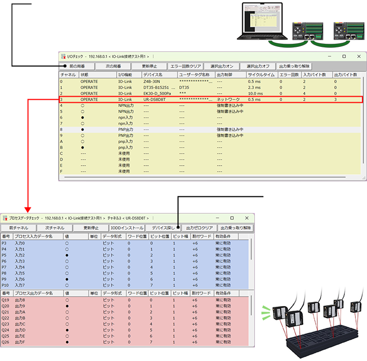 これにより、複数台のIO-Linkマスタに対するI/Oチェックを、簡単な操作で連続して実施することができます。