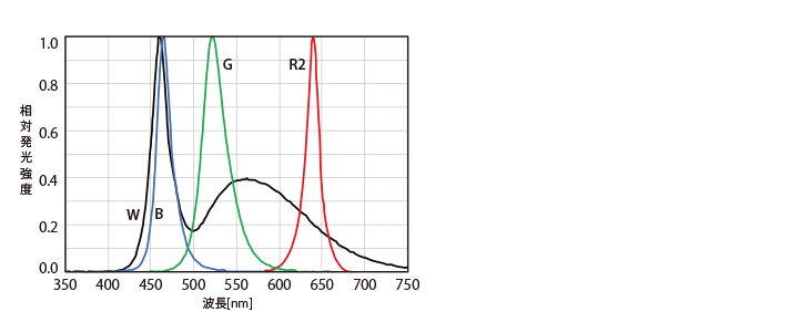 ●R2:赤(635nm) ●□=W:白(7000K)、B:青(470nm)、G:緑(525nm) ●スペクトル分布図は下記をご参照ください。